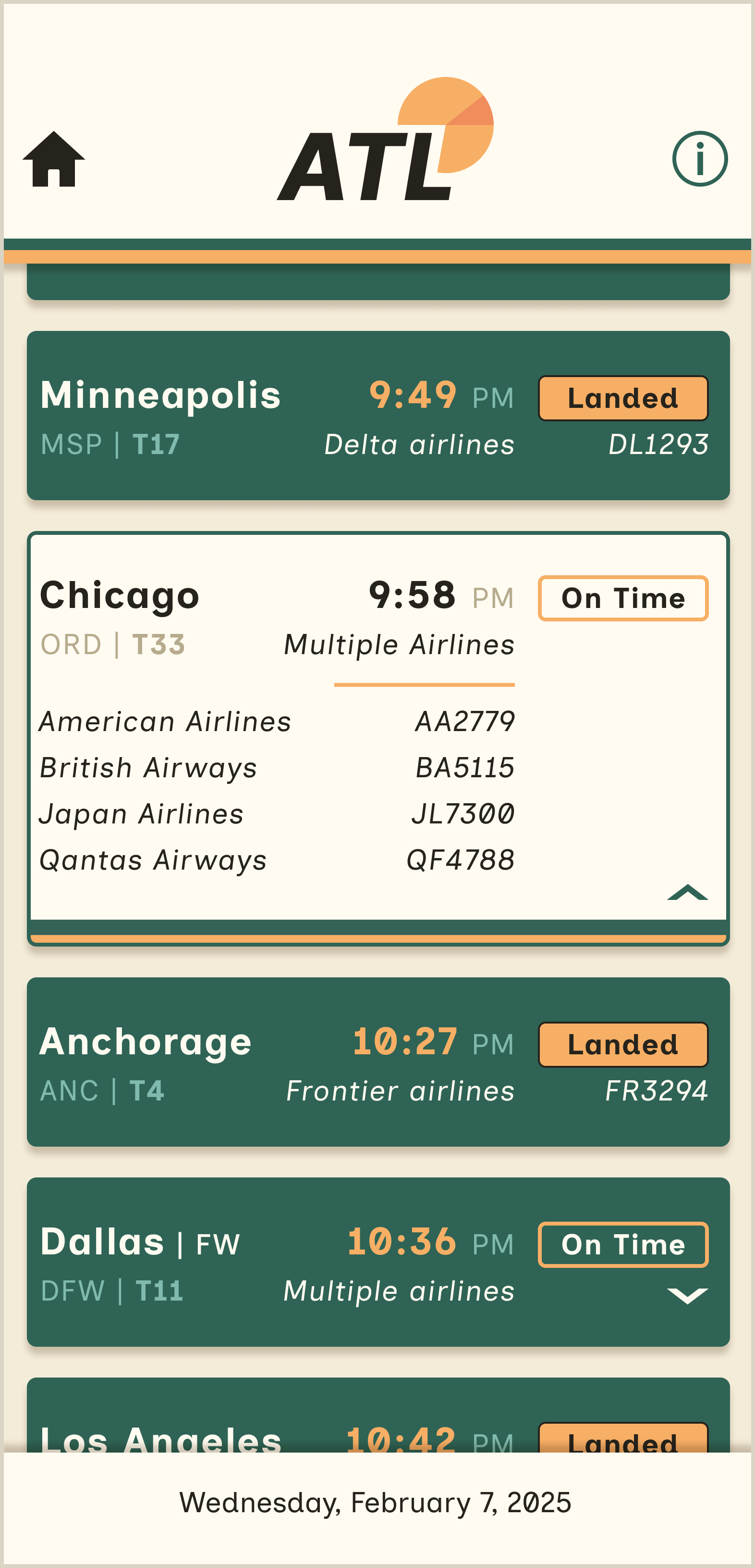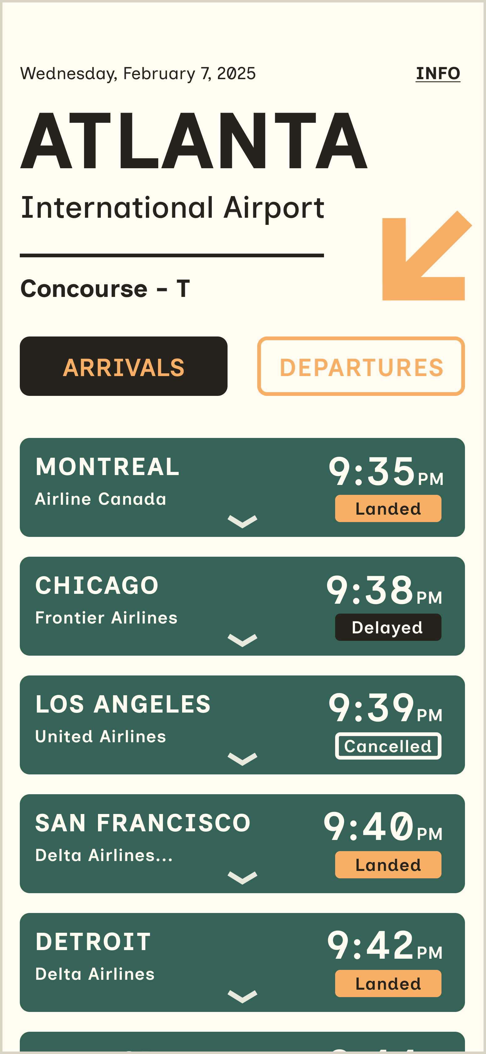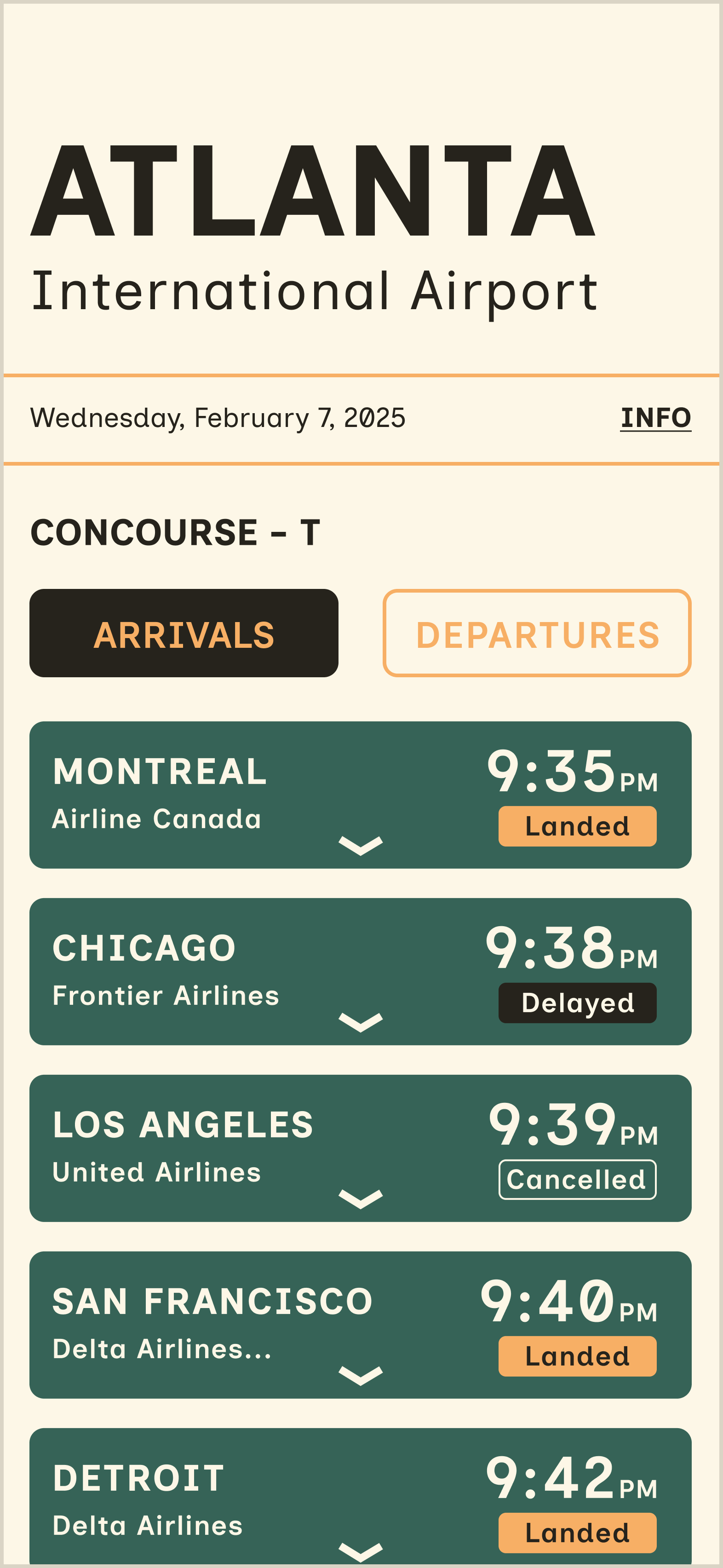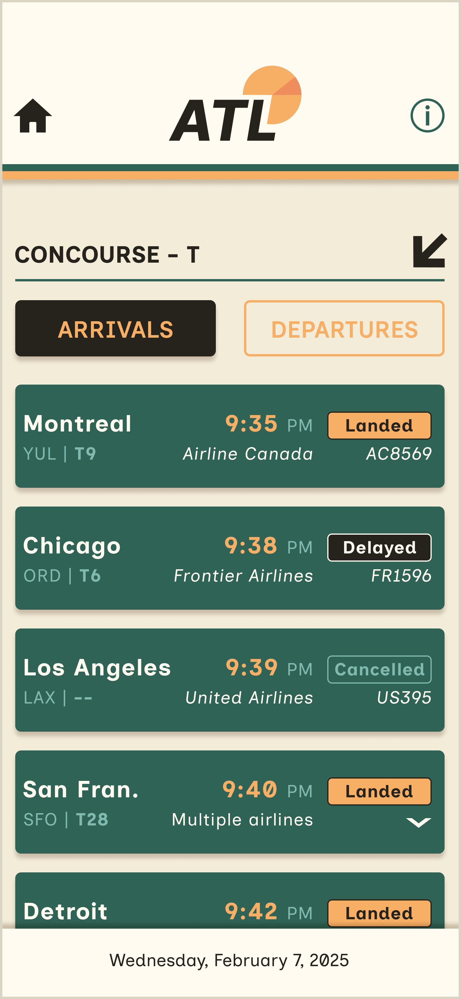 After sketching a layout, selecting a typeface, and picking a palette, I began creating digital iterations in Figma. The variations range from minor adjustments to major layout shifts. The final iteration features a fixed header and footer to keep the camera lens from obstructing any flight tiles.