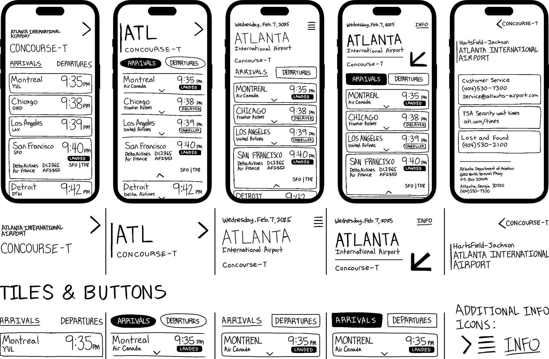 In these sketches, I focused primarily on experimenting with the design of buttons and tiles, as well as the layout of the upper section of the flight screens.