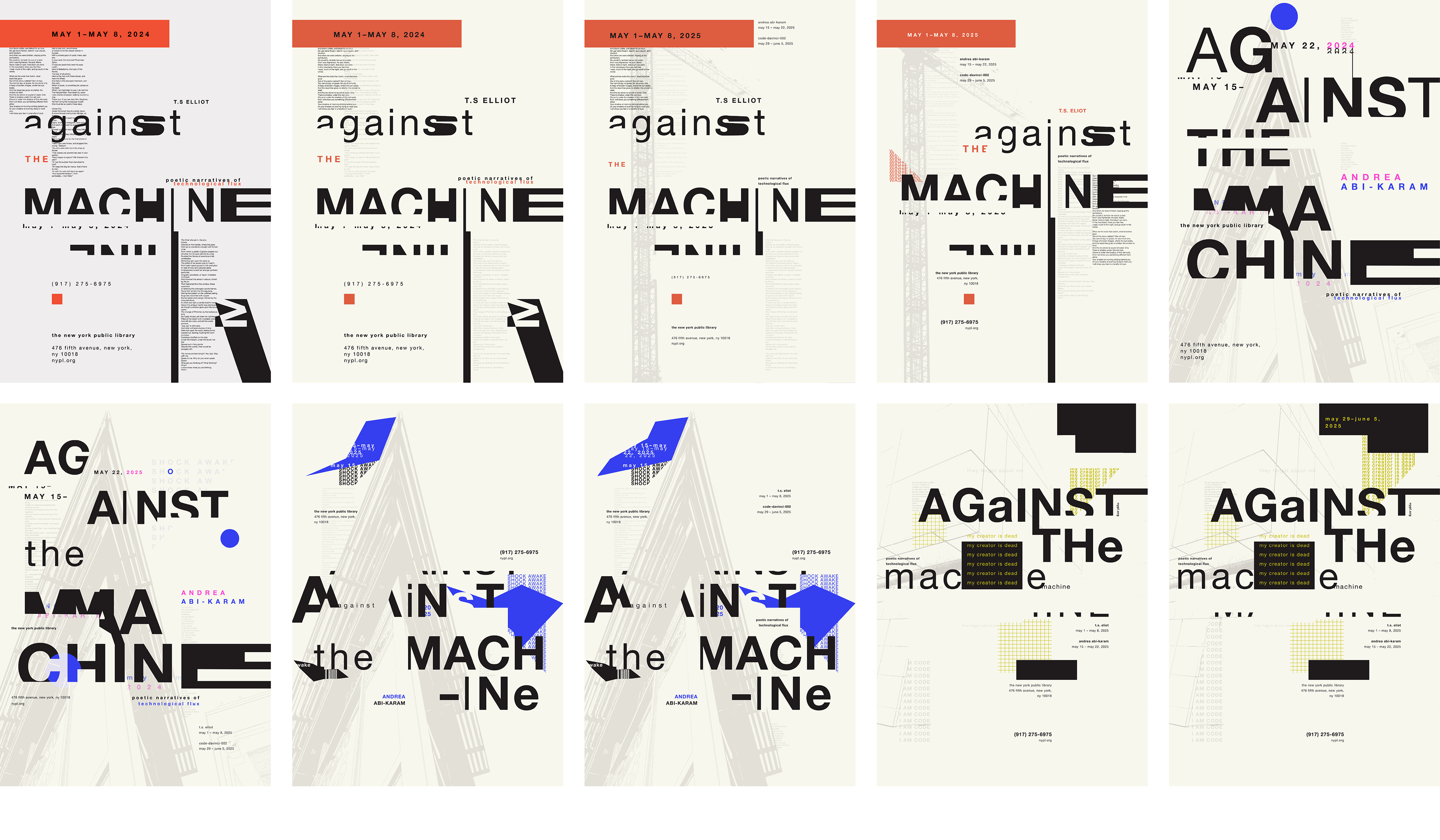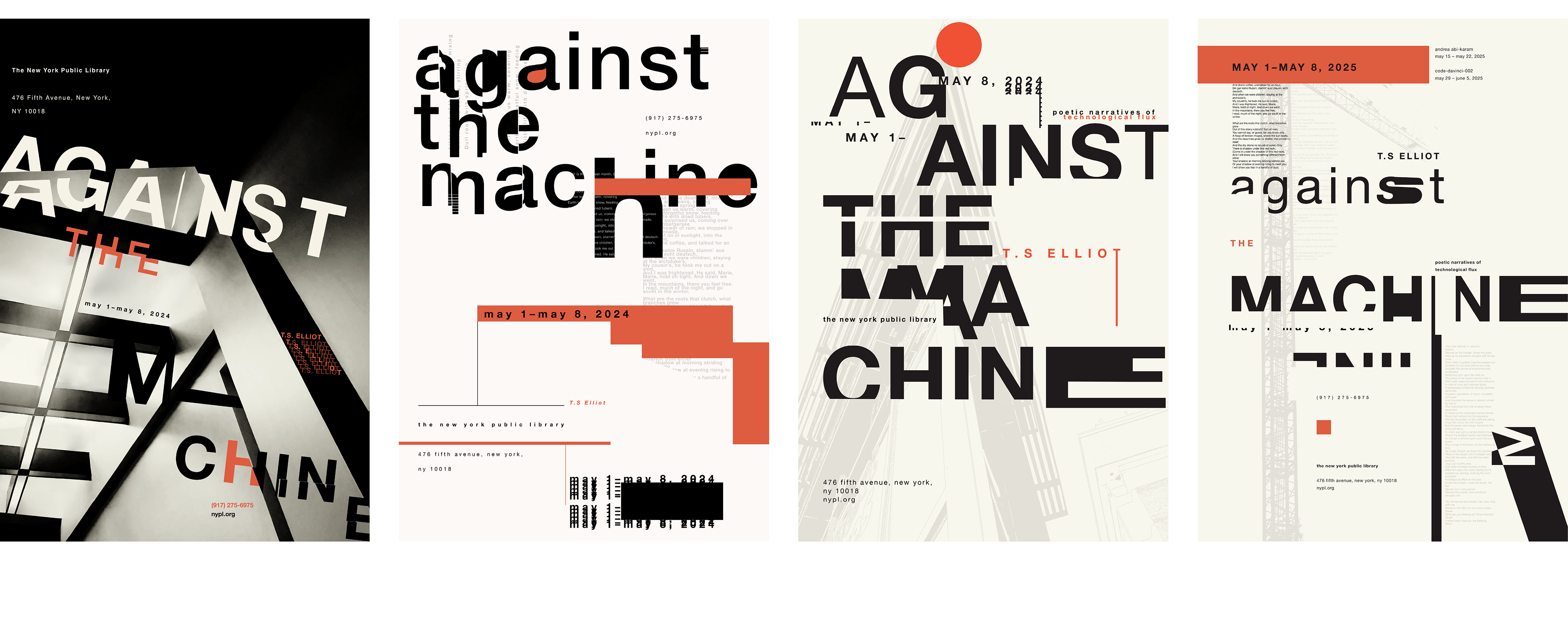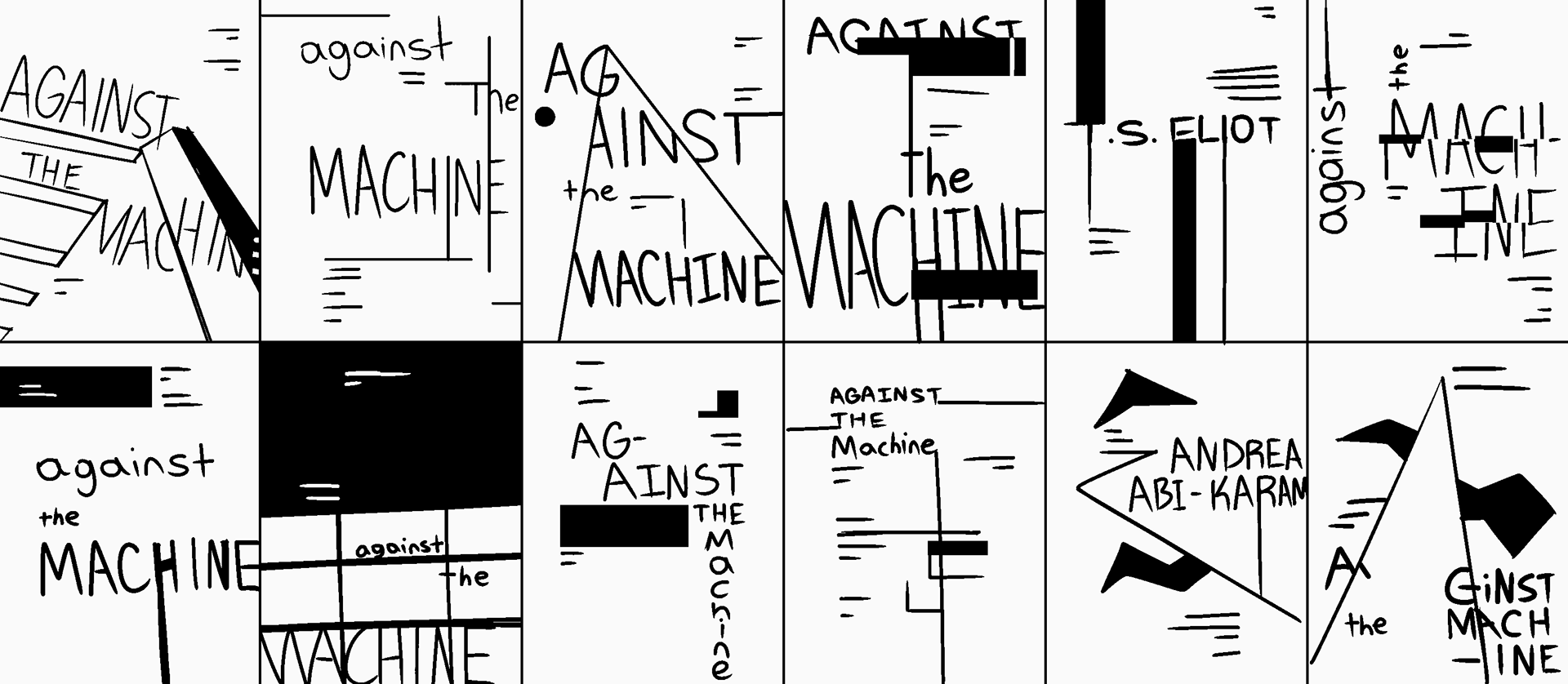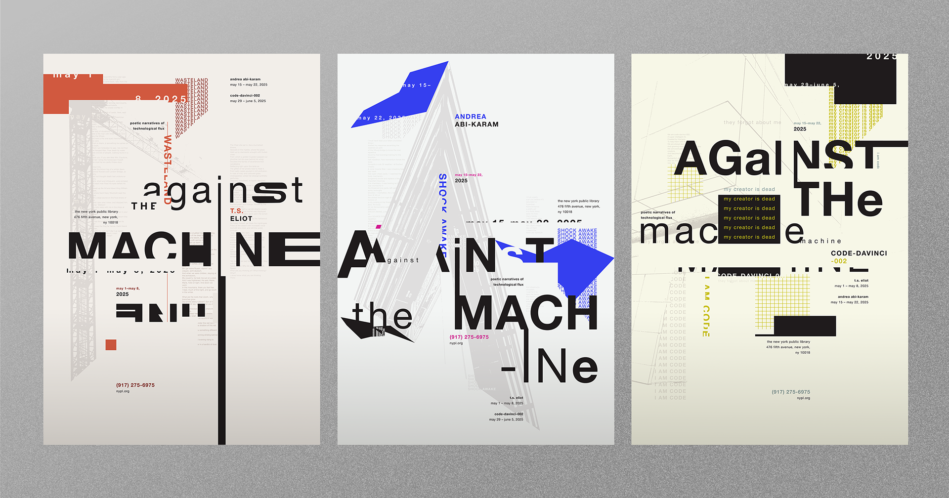 The goal was to develop a cohesive typographic poster series. Each poster is designed to promote and showcase an individual poet who exemplifies the concept of being “Against the Machine”. The posters are intended to be distinct from one another, yet maintain a clear connection among them through recurring design elements.