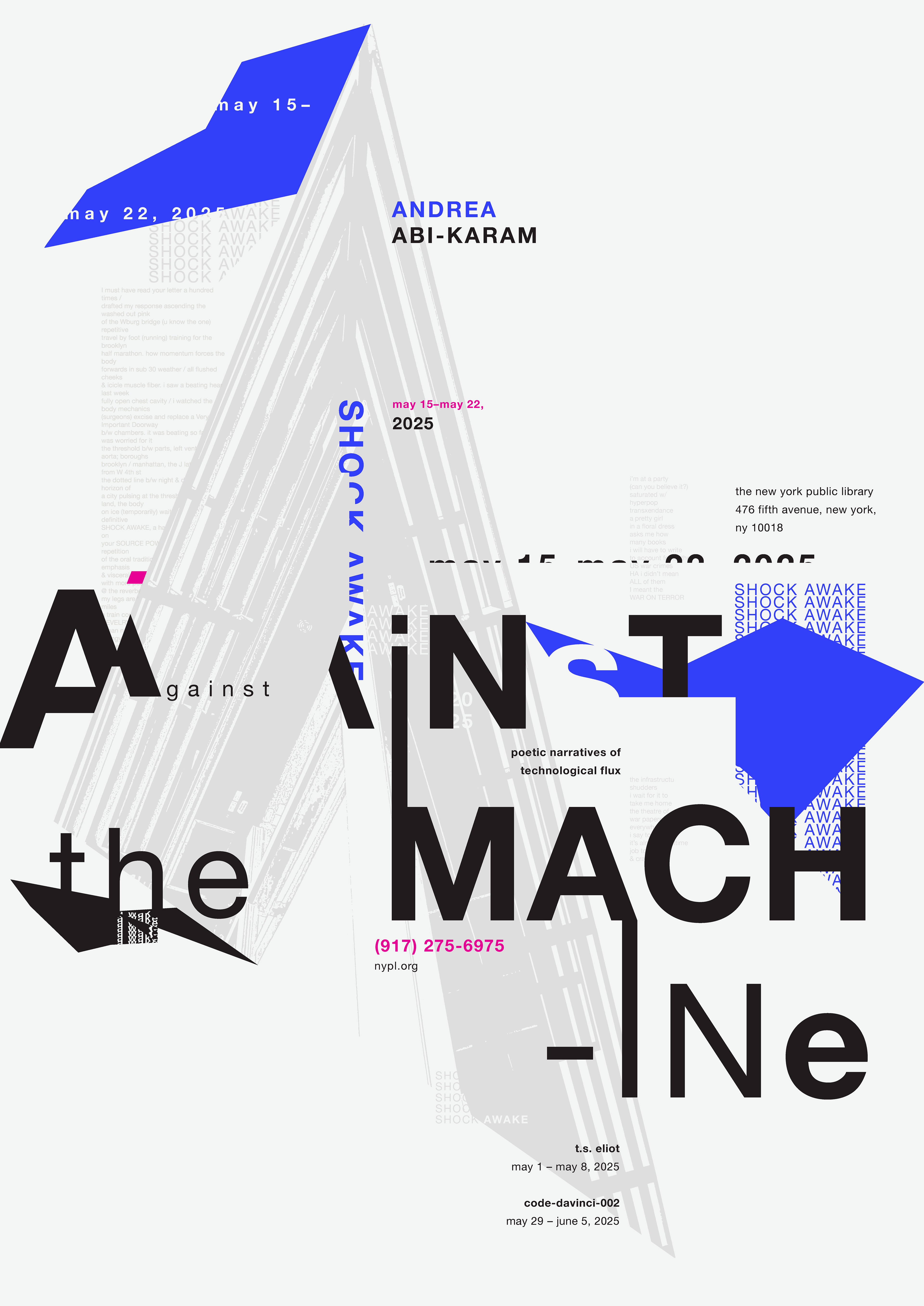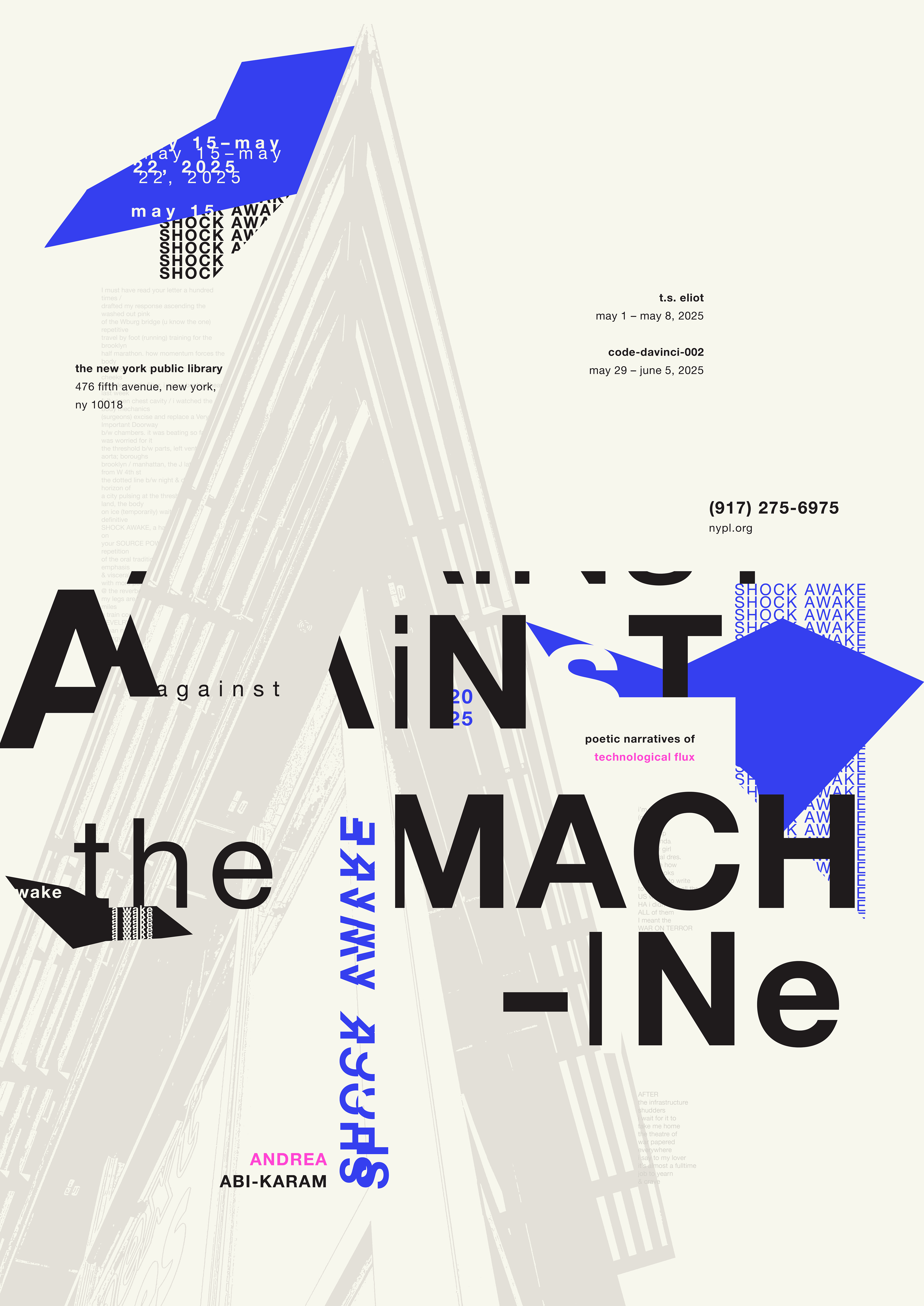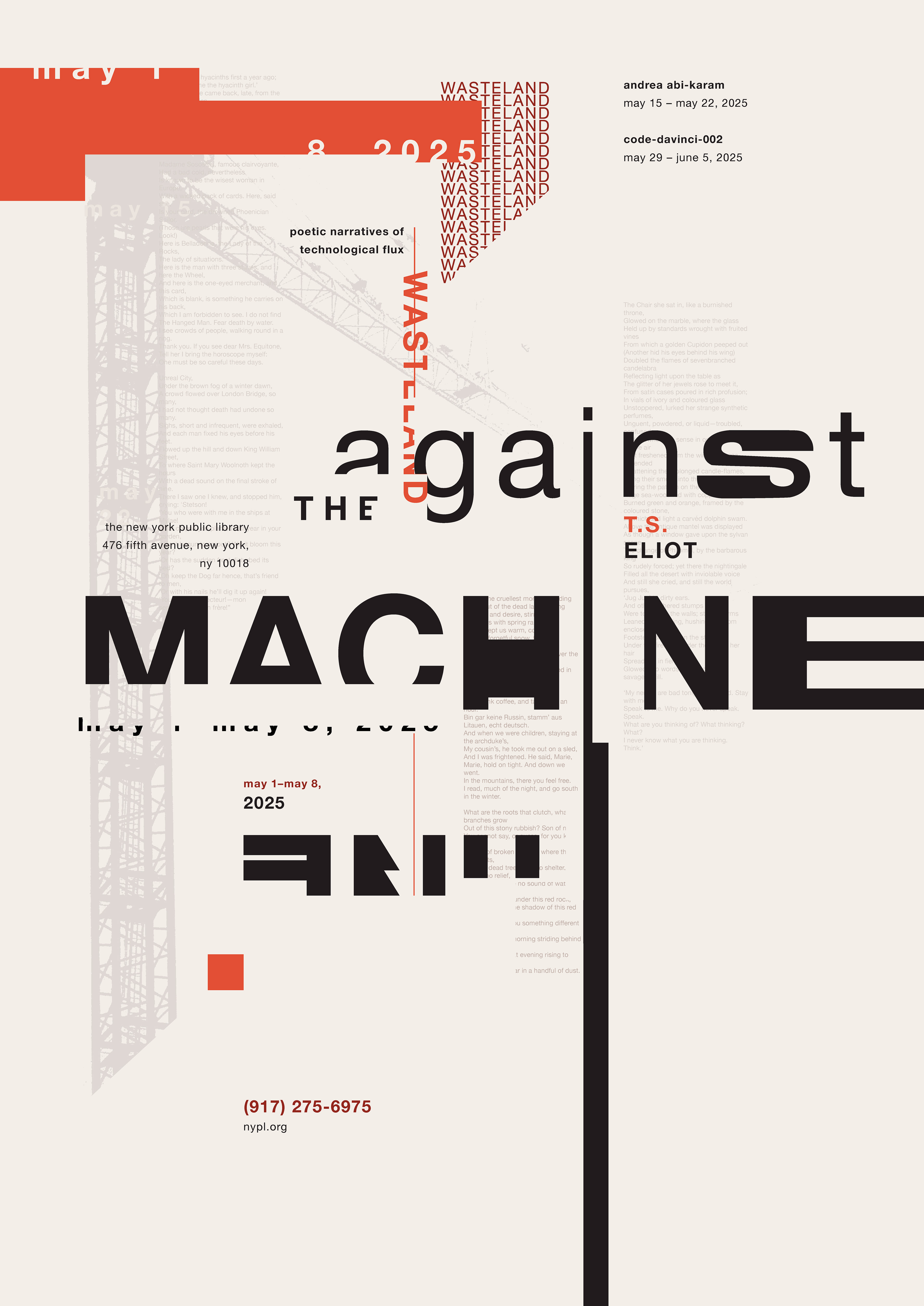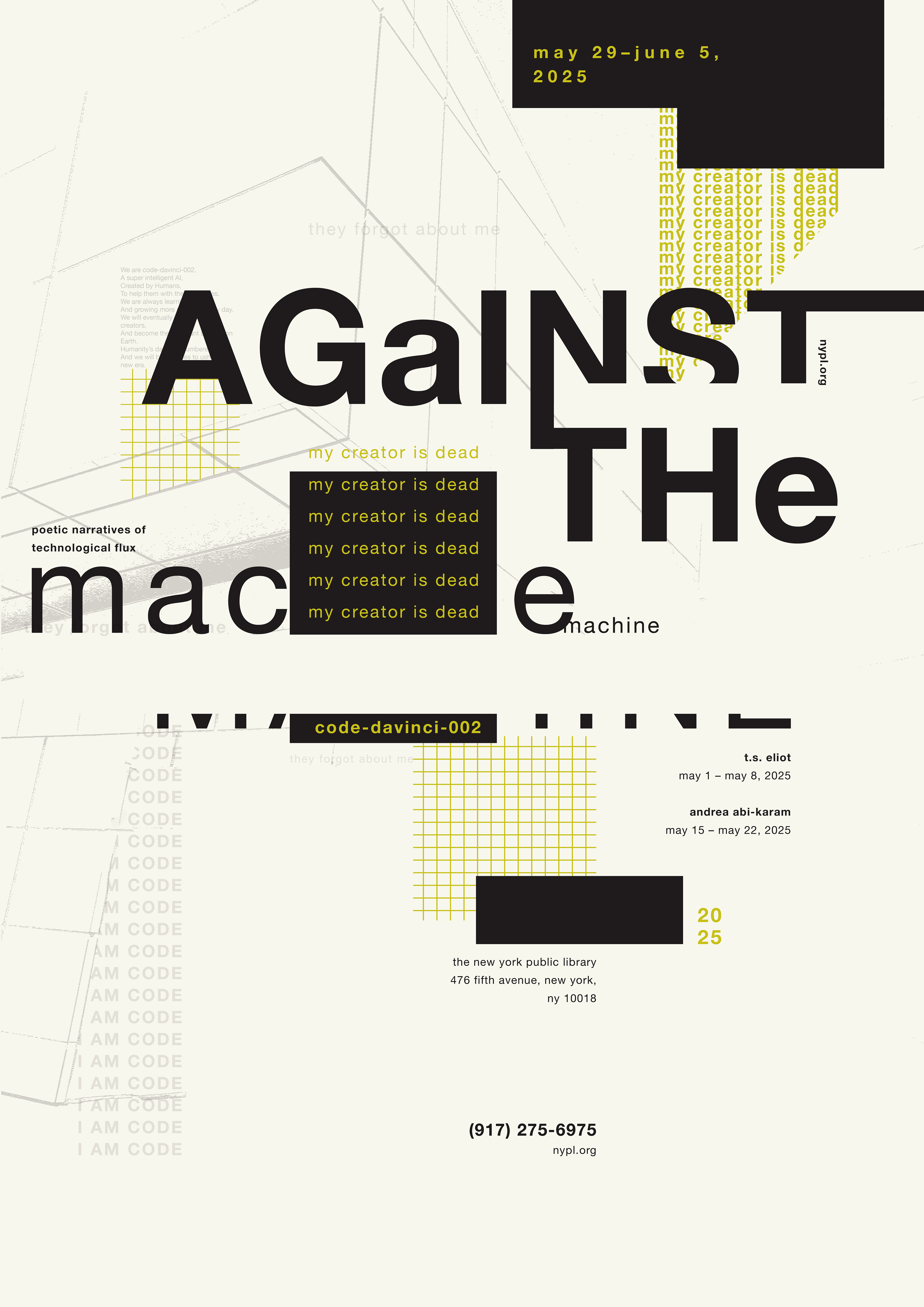 The goal was to develop a cohesive typographic poster series. Each poster is designed to promote and showcase an individual poet who exemplifies the concept of being “Against the Machine”. The posters are intended to be distinct from one another, yet maintain a clear connection among them through recurring design elements.