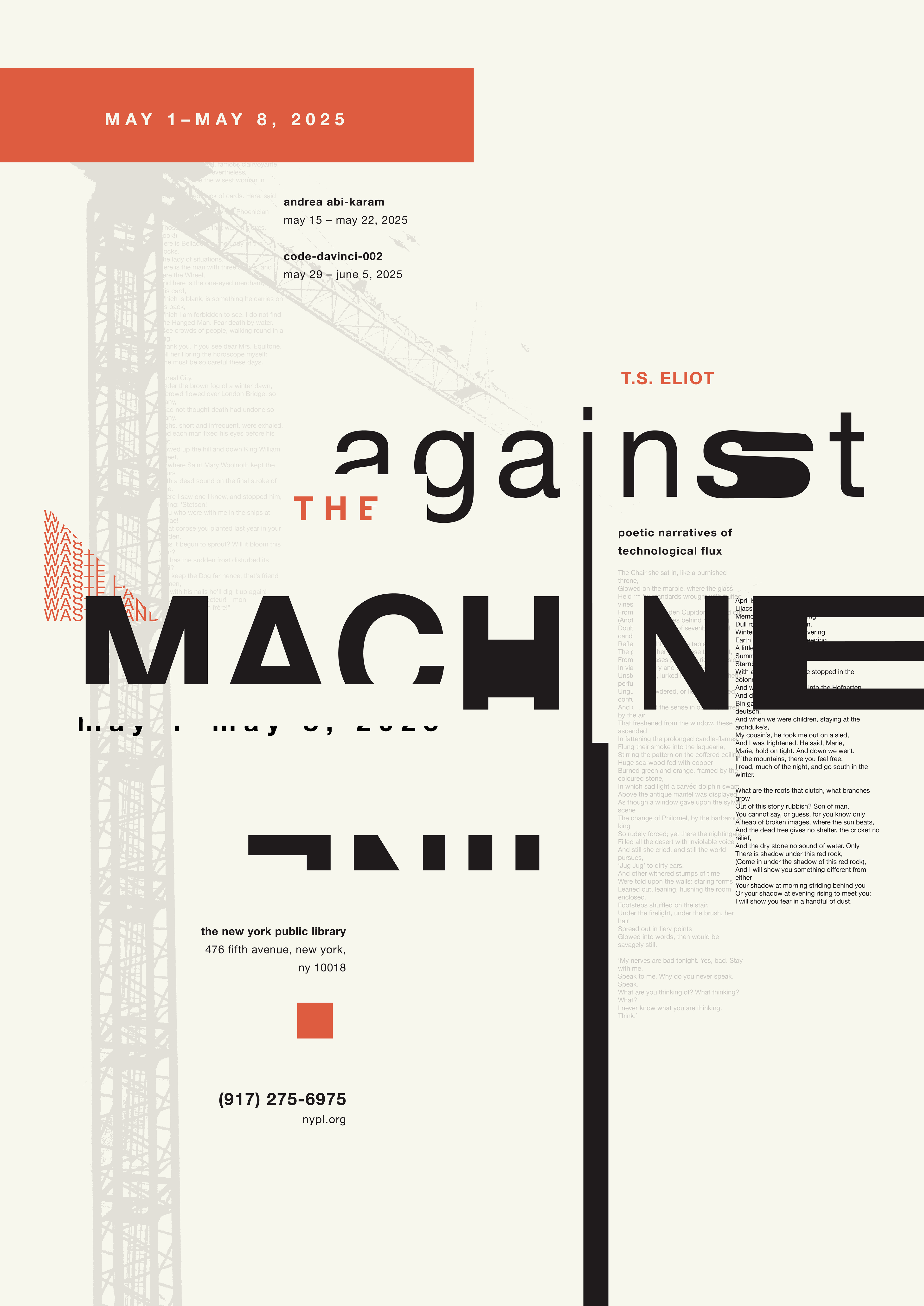 To me, the work of T.S. Eliot often evokes imagery that feels more industrial or "procedural." I associate this type of imagery with the color orange, as it is commonly used in construction and mechanized equipment.