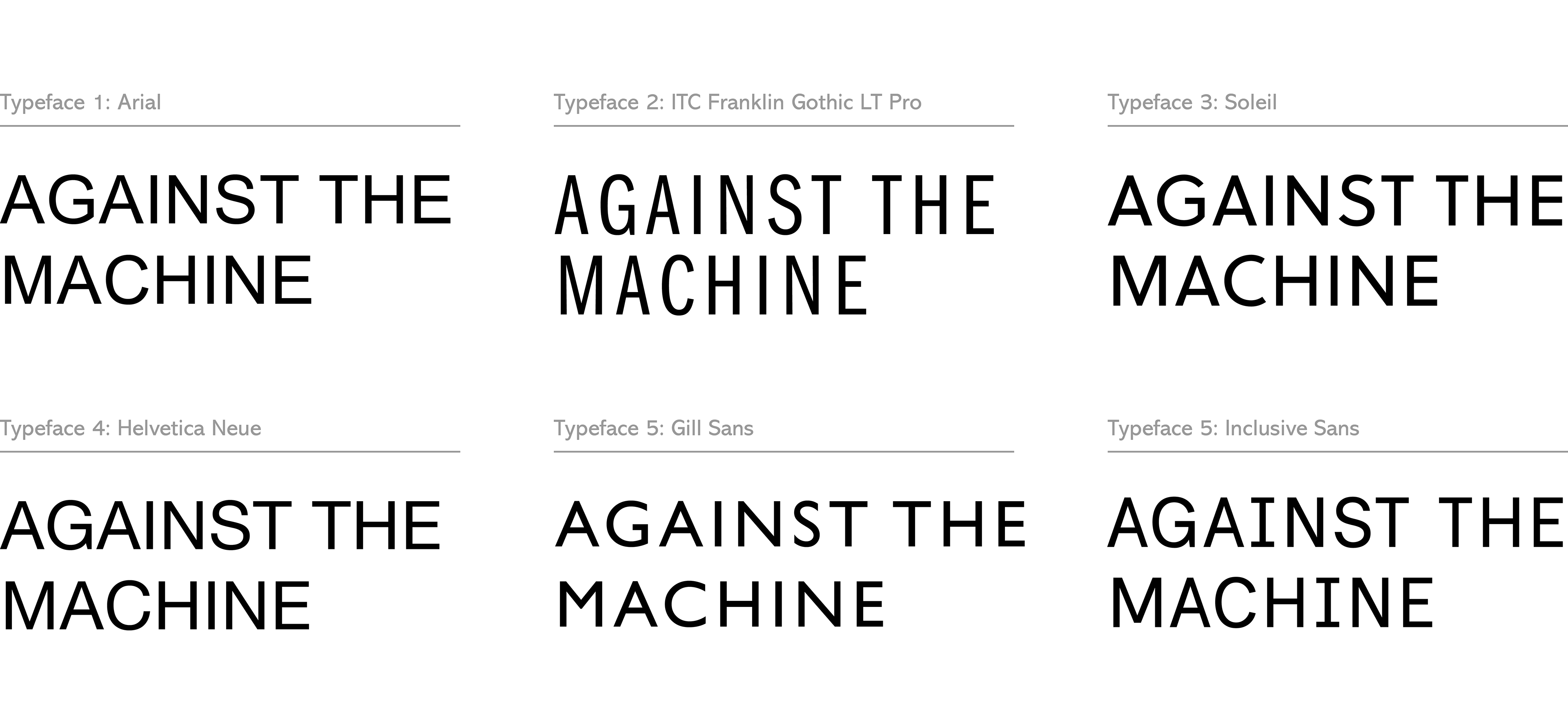 Six sans-serif typefaces were tested below to identify which most effectively evokes a robotic and sterile appearance. Serif typefaces weren’t considered because they tend to appear more traditional and comforting at times, which doesn’t suit my purpose.