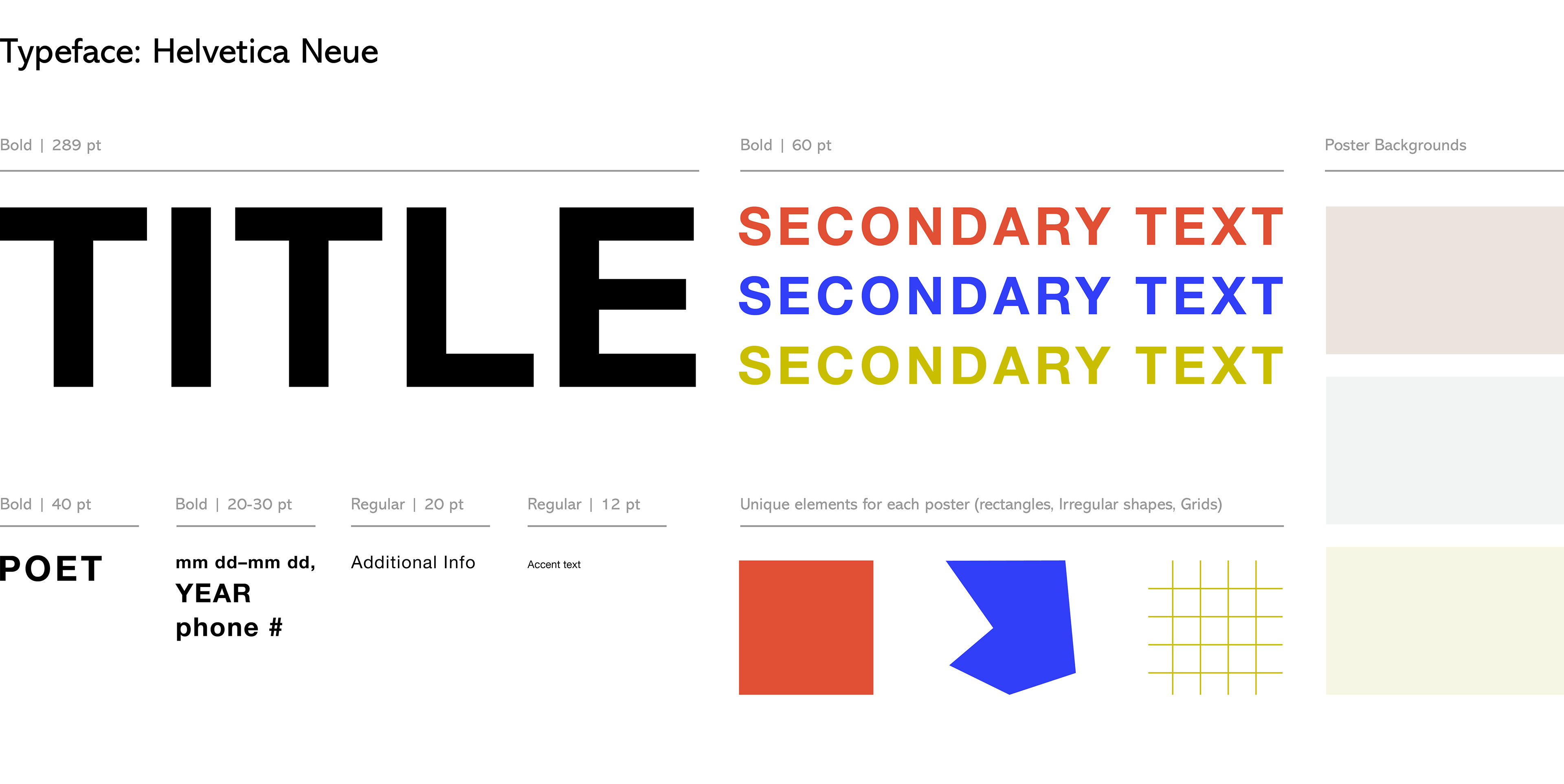 Includes the final color palettes for all three posters, the typeface and sizes I used, the unique elements, and the background colors.