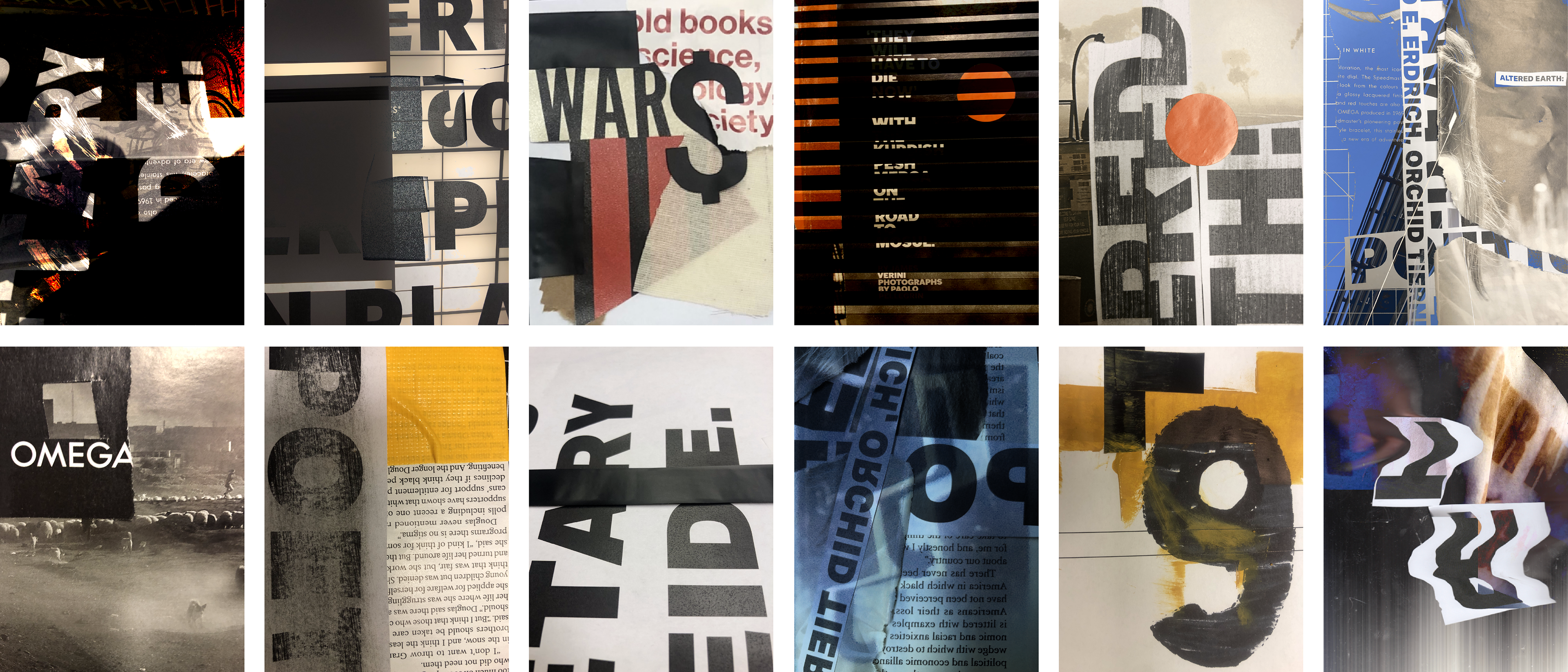 To begin, I experimented with physical materials and type to generate rough ideas for sketching. The ones showcased below are a mix of traditional compositions and those that have been digitally altered. Exploring ideas of obscurantism, disorder, and rebellion became my focus.