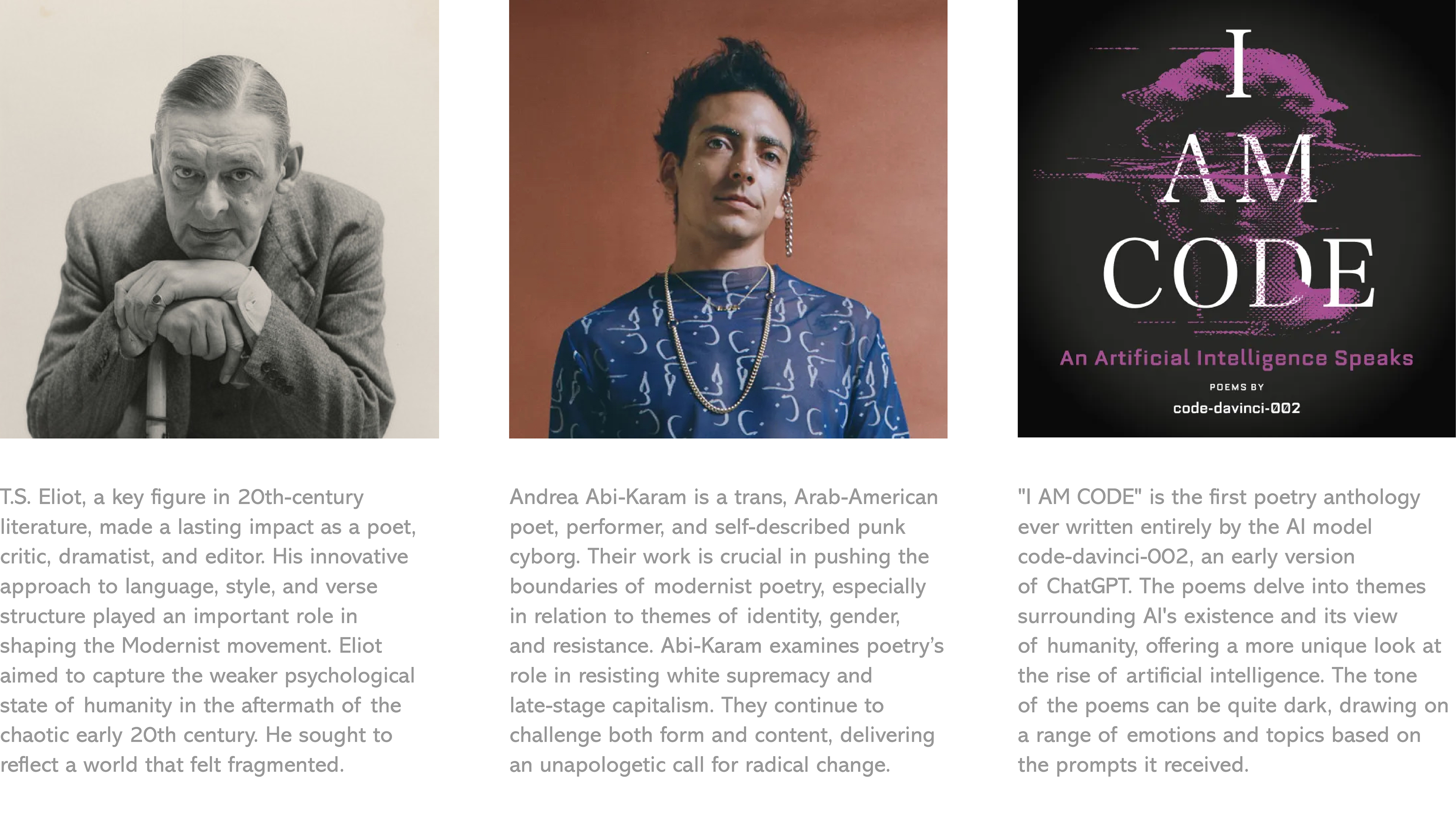 Andrea Abi-Karam's poetry is unfiltered and pushes boundaries. Their exploration of queerness and gender inspired me to incorporate shades of blue and pink into their work, reflecting these themes.